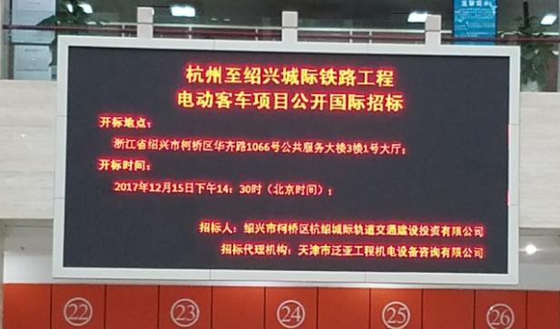 12月15日杭紹城際鐵路工程電客車(chē)在柯橋區公共資源交易中心完成開(kāi)標,12月17日完成評標,本次招標為吸引更多國際國內一流的車(chē)輛生產(chǎn)廠(chǎng)商,采用國際招標模式,招標內容為杭州至紹興城際鐵路工程108輛(4動(dòng)2拖6輛編組×18列)地鐵車(chē)輛。整個(gè)過(guò)程遵循公開(kāi)、公平、公正、科學(xué)合理、競爭擇優(yōu)的原則,最終車(chē)輛中標候選人為南京中車(chē)浦鎮城軌車(chē)輛有限責任公司,中標價(jià)61255.44萬(wàn)元。
