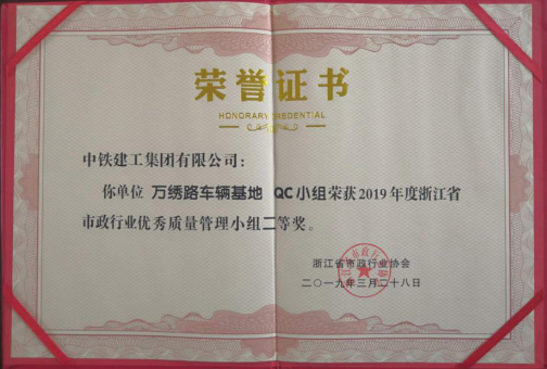 經(jīng)過(guò)評審專(zhuān)家對各項研究成果的材料評審和現場(chǎng)發(fā)布評分,杭紹城際鐵路工程SG-8標萬(wàn)繡路車(chē)輛基地QC小組被評為2019年度浙江省市政行業(yè)優(yōu)秀質(zhì)量管理小組。同時(shí)榮獲三項QC成果獎,分別是: