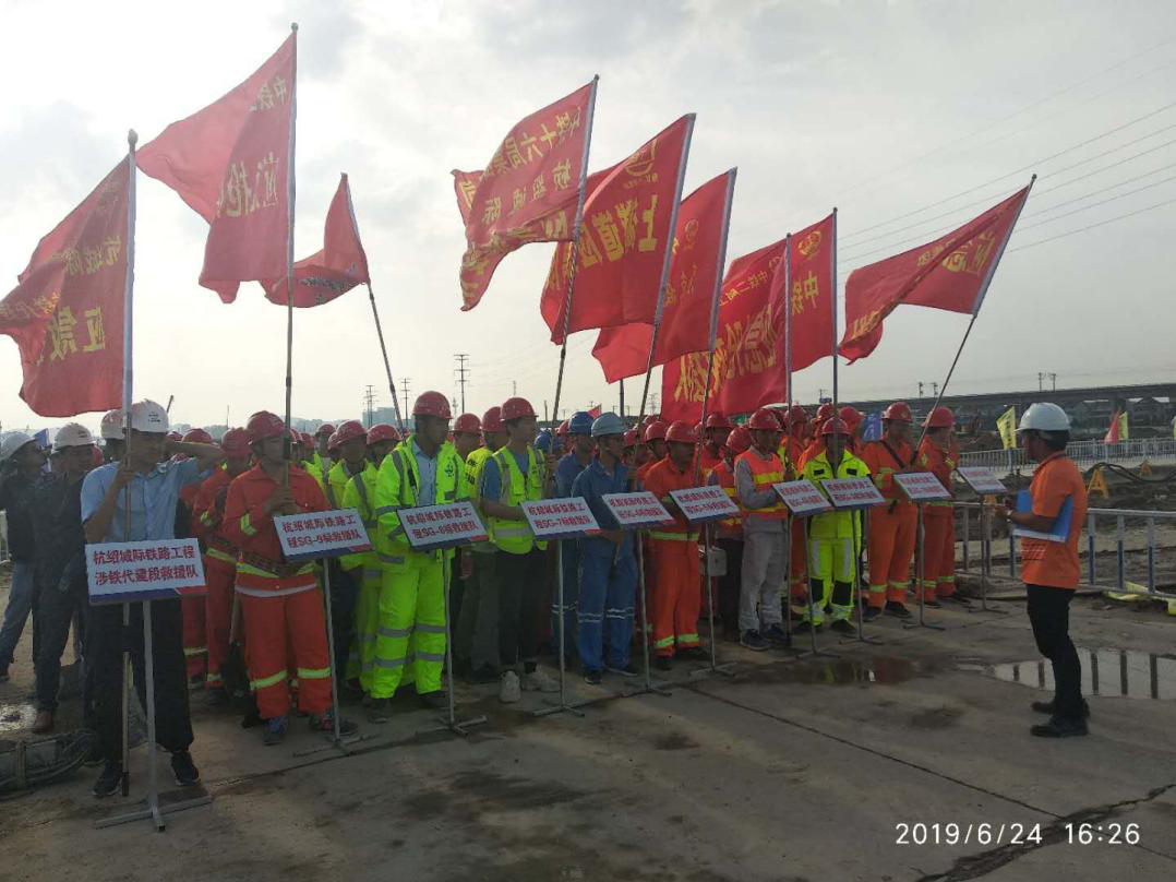 2019年6月24日集團公司組織開(kāi)展安全生產(chǎn)月應急拉練活動(dòng),本次拉練是以基坑涌水突泥為主題,拉練地址在SG-9標段萬(wàn)繡路車(chē)輛基地施工場(chǎng)地。由于受近期梅雨天氣影響,車(chē)輛基地區域水位偏高,導致河水倒灌,引起基坑內水流沉積,極易引發(fā)的基坑涌水突泥事件,為應對防汛防洪等應急事件的發(fā)生做好充分準備,提高人員的配合聯(lián)動(dòng)性和快速反應能力,集團公司組織杭紹城際鐵路各參建單位開(kāi)展本次拉練活動(dòng)。
