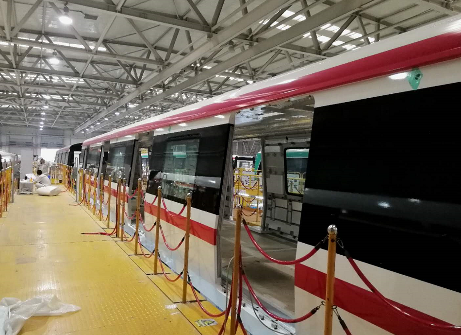 目前,6輛首列車(chē)均已進(jìn)入總裝階段。車(chē)輛已完成客室車(chē)窗玻璃粘接、地板防寒材鋪裝及地板布粘接、車(chē)下管路及線(xiàn)槽敷設等工序,車(chē)頂空調安裝、車(chē)內布線(xiàn)、機柜安裝、底架設備安裝等工序也正在有條不紊的進(jìn)行中。首列車(chē)轉向架構架制造已全部完成,并陸續開(kāi)始總裝。