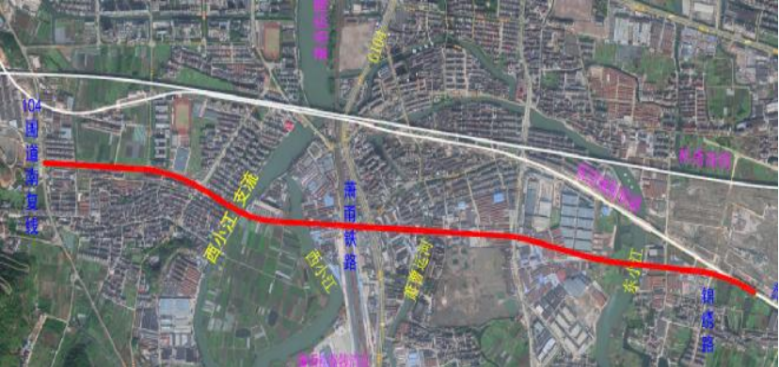 項目起點(diǎn)位于現狀群賢路西沙路站(杭紹城際鐵路)南側,終點(diǎn)位于 104 國道南復線(xiàn),路線(xiàn)總長(cháng)約4.01km,主要構造物有橋梁長(cháng) 416m/2座,隧道長(cháng) 2190m/1座。包含主線(xiàn)和地面道路兩部分,主線(xiàn)道路等級為城市主干路,雙向6車(chē)道規模,路基標準段寬度39m,設計速度60km/h。地面道路(鎮東路-104 國道)采用城市次干路標準,雙向4車(chē)道規模,設計速度40km/h,全長(cháng)約782m。項目主要包括道路工程、隧道工程、交通工程、排水工程、管線(xiàn)工程、綠化工程及其他基礎設施配套工程等。