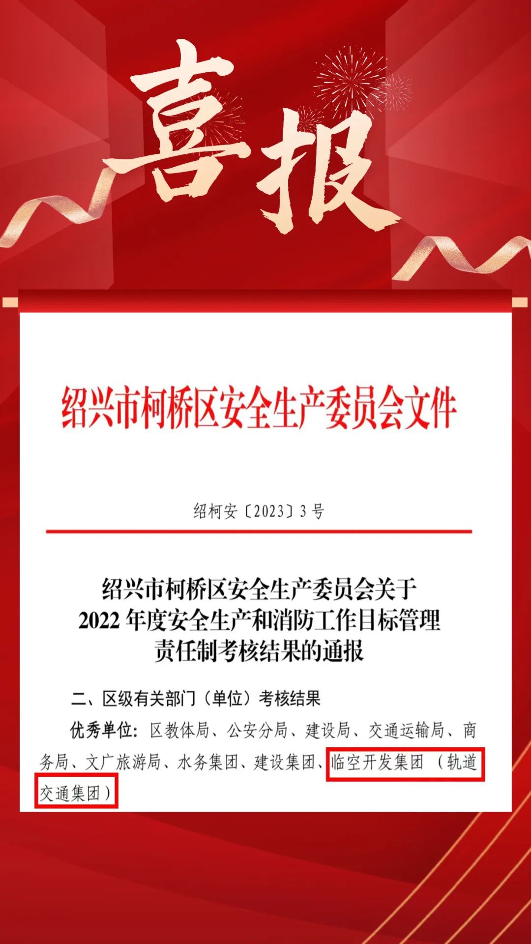 日前,紹興市柯橋區安全生產(chǎn)委員會(huì )印發(fā)《關(guān)于2022年度安全生產(chǎn)和消防工作目標管理責任制考核結果的的通報》(紹柯安發(fā)【2023】3號),臨空開(kāi)發(fā)集團(軌道交通集團)被評為考核優(yōu)秀等次。