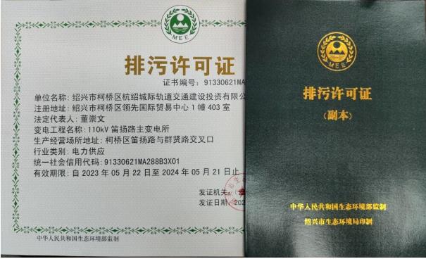 5月22日,全國首張軌道交通變電工程排污許可證——杭紹城際軌道交通建設投資有限公司110kV笛揚路主變電所排污許可證由浙江省紹興市生態(tài)環(huán)境局核發(fā),在國內率先將城市軌道交通變電工程正式納入排污許可試點(diǎn)管理。