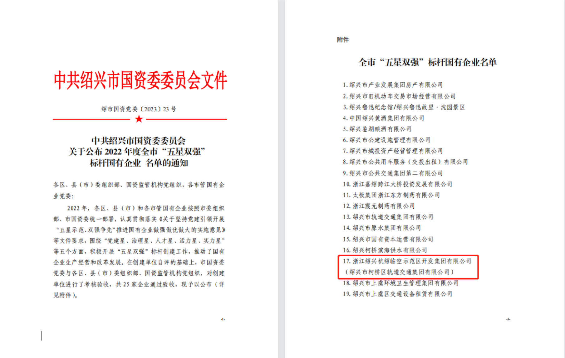近日,市國資委下發(fā)《中共紹興市國資委委員會(huì )關(guān)于公布2022年度全市“五星雙強”標桿國有企業(yè)名單的通知》,浙江紹興杭紹臨空示范區開(kāi)發(fā)集團有限公司(紹興市柯橋區軌道交通集團有限公司)榮獲“五星雙強”標桿國有企業(yè)。