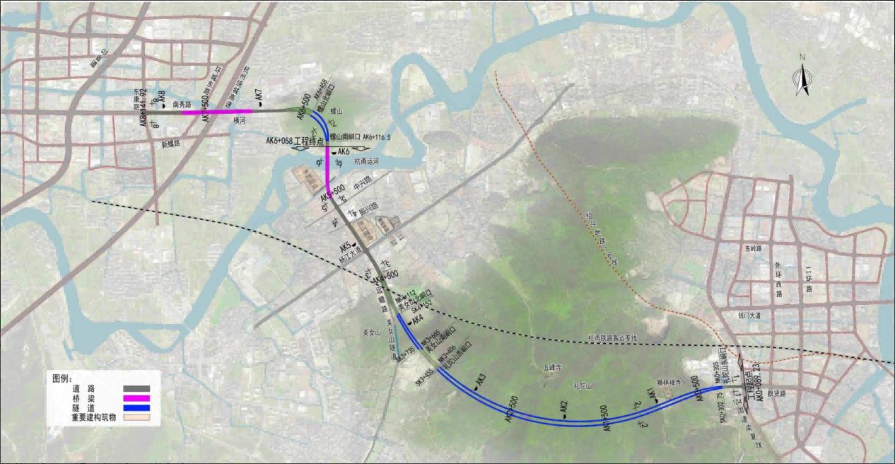群賢路西延蕭山南秀路二期工程修建的是城市主干路,東起104國道南復線(xiàn),西至中興路交叉口北側,路線(xiàn)以隧道形式向西連續穿越禮陀山、美女山,出隧道后向北下穿杭深鐵路橋,繼續途徑楊汛橋鎮后至中興路北側止,路線(xiàn)全長(cháng)約5.34km,禮陀山隧道段長(cháng)約3Km,美女山隧道長(cháng)約460m,設計時(shí)速60Km/h,雙向六車(chē)道。
