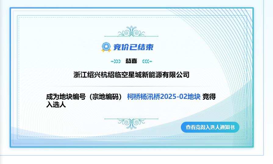 一、喜訊!浙江紹興杭紹臨空星城新能源有限公司土地競拍成功
